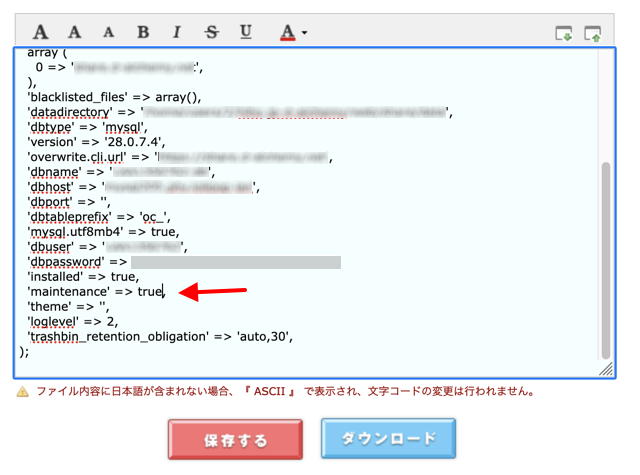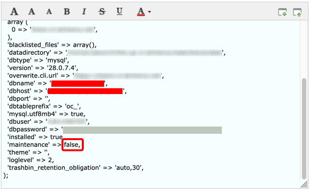 まず、Nextcloud をメンテナンスモードにします。config/config.php の "maintenance" => false, の行を "maintenance" => true に書き換えます。ロリポップFTP を使えば、オンラインで編集できます。