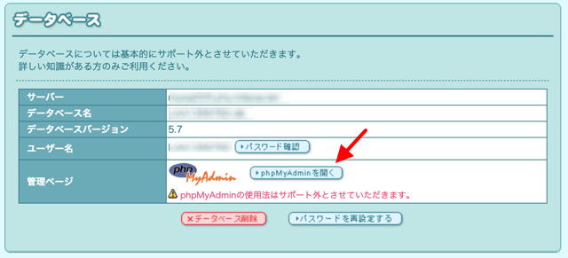 ユーザー名とパスワードを入れて、サーバを選択して(忘れがち)、phpMyAdmin の画面を開きます。