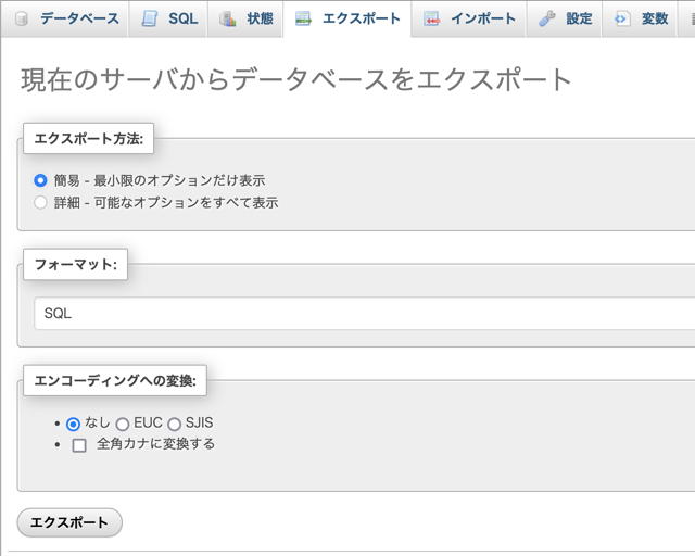 「エキスポート」でデータベースの内容をファイルに書き出します。エキスポート方法は「簡易」でよいと思います。ブラウザによって sql ファイルがダウンロードされます。サイズは 47 MB でした。