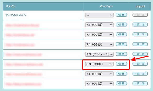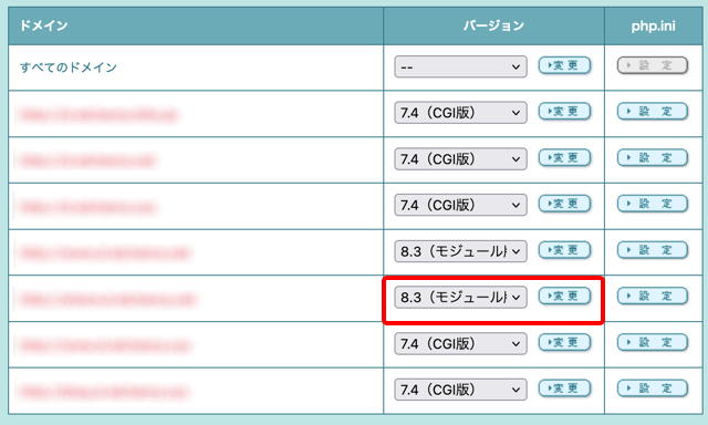 最初に、ロリポップの PHP を「モジュール版」から「CGI版」に切り替えます。モジュール版では途中でメモリ不足を起こします(参照:「Nextcloud 突然止まる→アップデート」)。「設定」を押してから、5〜10分程度かかります。