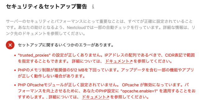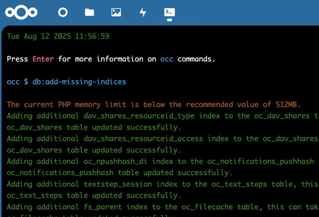 いくつかの欠落しているオプションのインデックスを検出しました。データベースのパフォーマンスを向上させるために、(Nextcloudまたはインストールされたアプリケーションによって)新しいインデックスが追加されることがあります。(中略)インデックスを追加するには、`occ db:add-missing-indices` コマンドを使用してください。