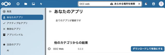 OCC Web アプリを見つけるには、右上のメニューから「アプリ」を選んで、左のタブで「あなたのアプリ」を選んだあと(重要)、検索アイコンをクリックして "OCC Web" と入力します。