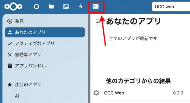 このアイコンをクリックすると、黒いコンソール風の画面が出てきます。occ のコマンドを入力すると、実行してくれます。これがあれば ssh 接続がなくても大丈夫ですね。