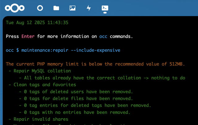 こんな風に occ .... コマンドを使う、という指示がときどきあるのですが、ロリポップのライトプランには ssh 接続の機能がありません。どうするんだ?と思って調べたところ、Nextcloud に OCC Web というアプリを入れたら、occ コマンドをウェブベースで実行できるそうです。