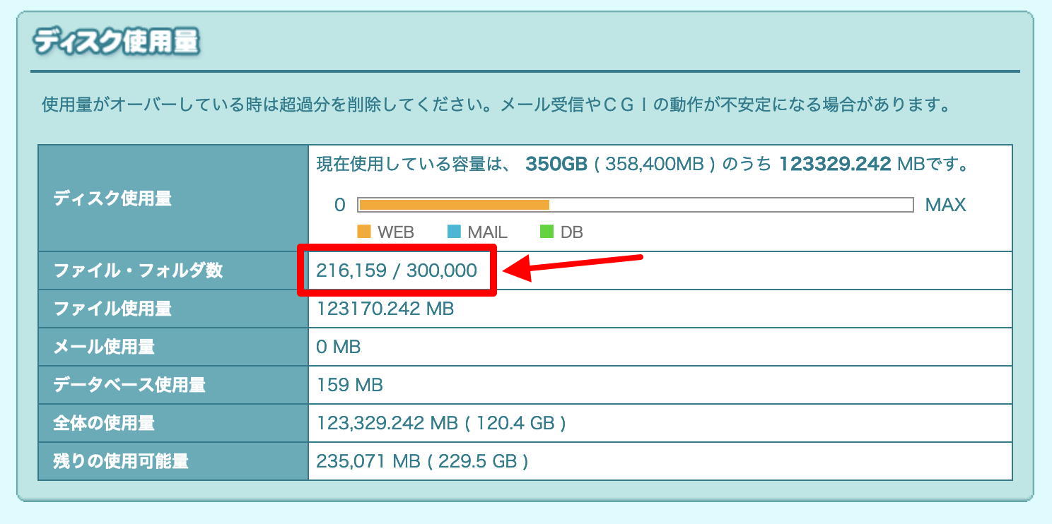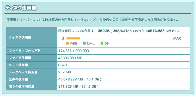 ところで、この機会にロリポップのディスク使用状況を確かめたところ、えらいファイル数が多いことに気づきました。20万個もファイル作ってるかな?? ロリポップのライトプランにはファイル数の上限(30万個)があるので、気になるところです。