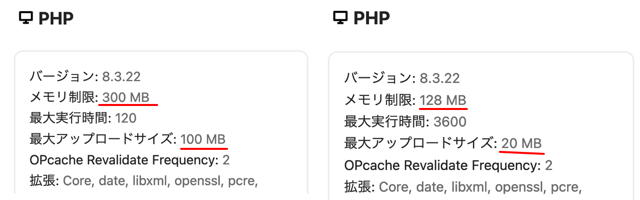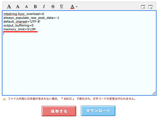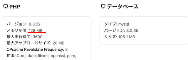 PHPのメモリ制限が推奨値の512 MBを下回っています。アップデータを含む一部の機能やアプリが正しく動作しない場合があります。
