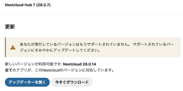 「Nextcloud のメンテナンス(1)」の続きです。28.0.7 から 31.0.7 へアップグレードします。まずマイナーバージョンの最終版まで上げて、それからメジャーバージョンを1つ上げて、という繰り返しになります。