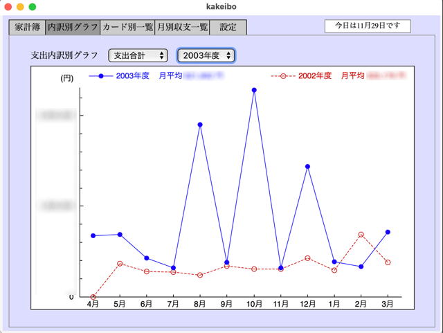 1年単位で、月ごとの内訳別グラフを表示できます。