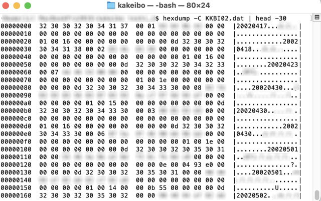 ところで、昔の「みんなの家計簿」のデータを吸い出すのにかなり苦戦しました。古いバックアップから 2010 年ごろのファイルを救出したのはよかったのだけど、手元の一番古い環境(Mac OS Lion)で「みんなの家計簿」を動かしてみても、データが読めず、エキスポートもできませんでした。仕方なく、hexdump でバイナリデータをダンプして、解析しました。こんな作業をやったのは久しぶりだな。