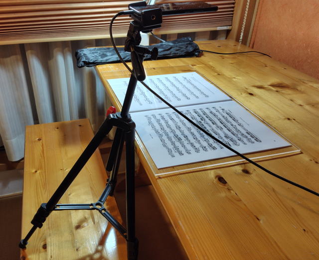 こんなセットアップでやっています。写真だと見づらいのですが、楽譜の上に透明アクリル板を置いて、ページが平面になるように押さえています。