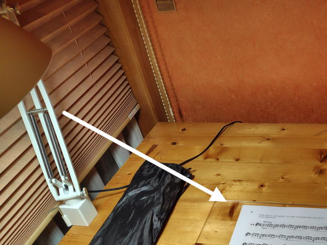 三脚にスマホを固定しています。三脚を普通に立てると、脚が邪魔で真上から撮影ができません。そこで、三脚の脚の1本を長めに伸ばして、斜めに立てています。これで、楽譜のほぼ真上にスマホを持ってくることができます。多少斜めにはなっていますが、この程度なら後で補正が可能です。